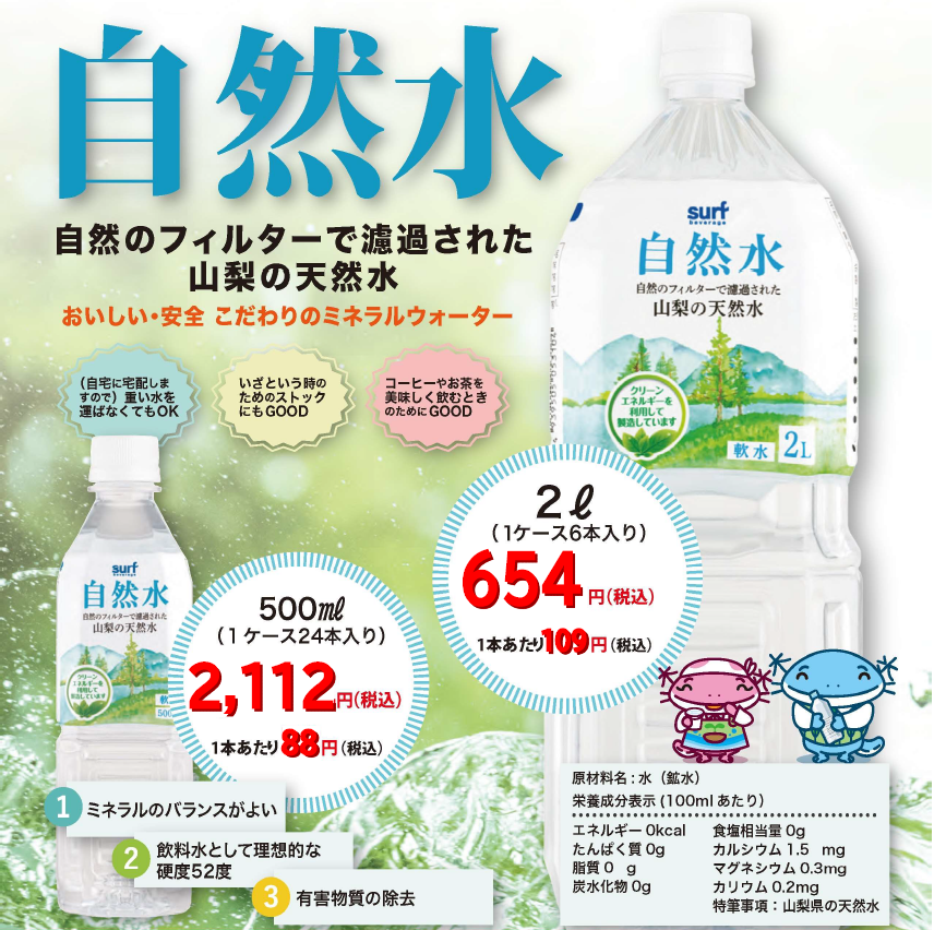 | 2010年4月 | ミネラルウォーターペットボトルの販売 富士山美水・奥軽井沢天然水 |